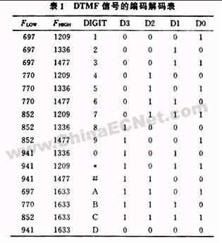 对照表1可以发现DTMF信号由2个不同的频率信号合成。分为高频组和低频组,包各含有4个频率,可以构成16种不同的信号,依次对应着16个不同的BCD码。
